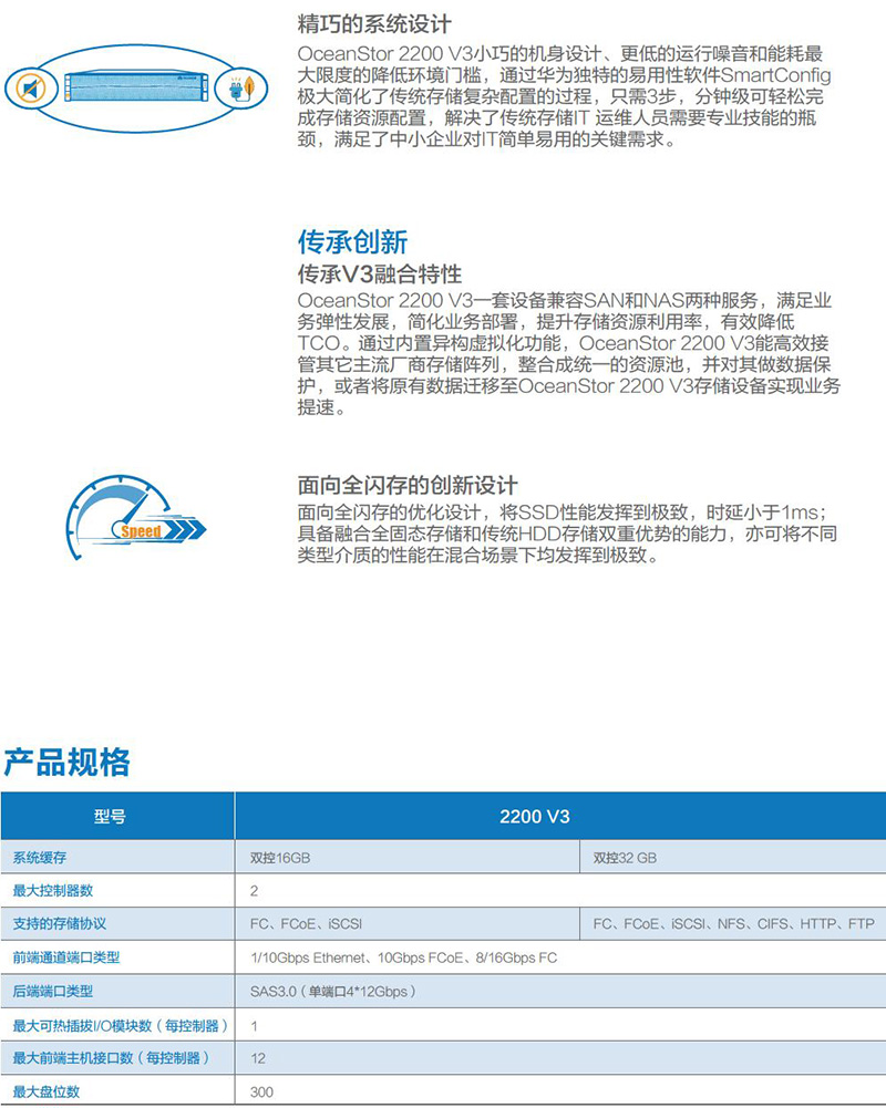华为OceanStor 2200 V3是面向全闪存设计的企业入门级存储产品,满足中小型企业数据库OLTP/OLAP、Exchange、服务器虚拟化和视频监控等各种应用需求。